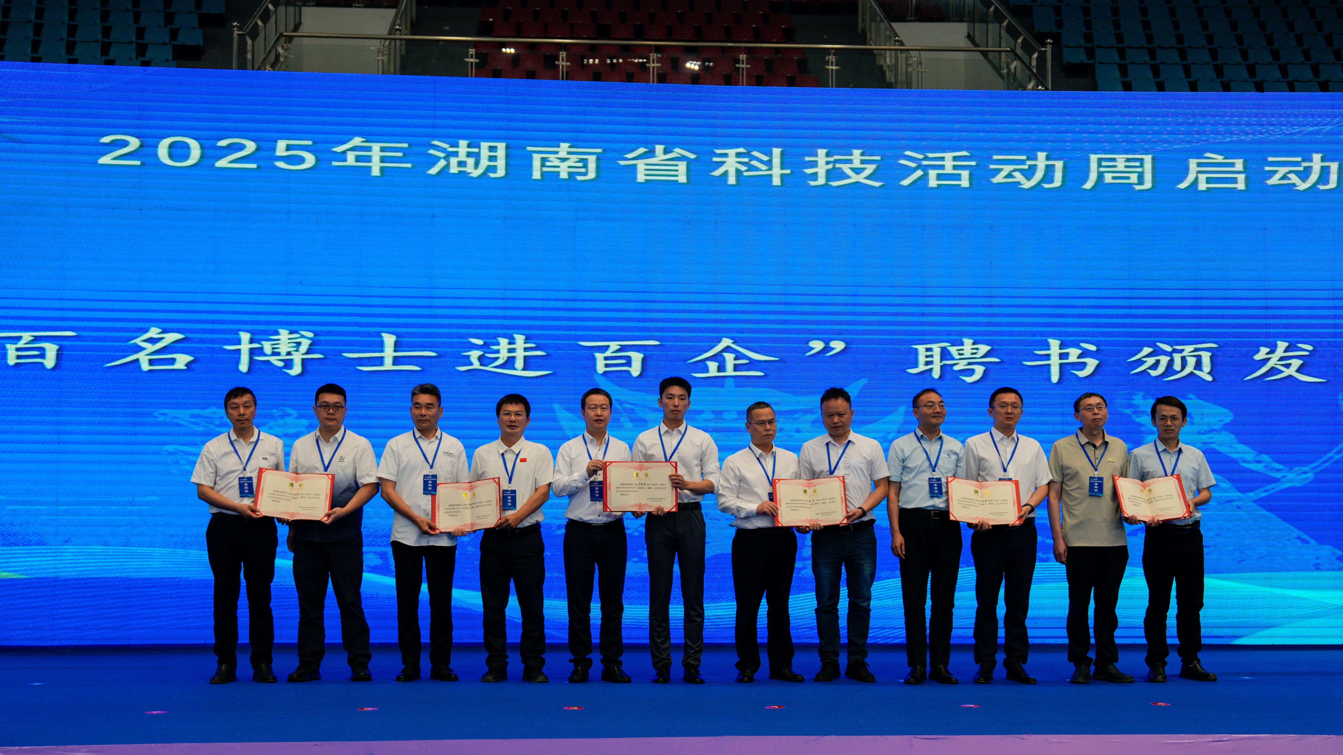启动式上,学校教师代表宣读“投身创新创业热潮 助推‘三高四新’发展”倡议书,领取湖南中瑞智创增材科技有限公司等企业代表颁发的“百名博士进百企”聘书,副省长曹志强等为重大示范活动“科技潇湘行”承办地平江县和科技服务小分队授旗。