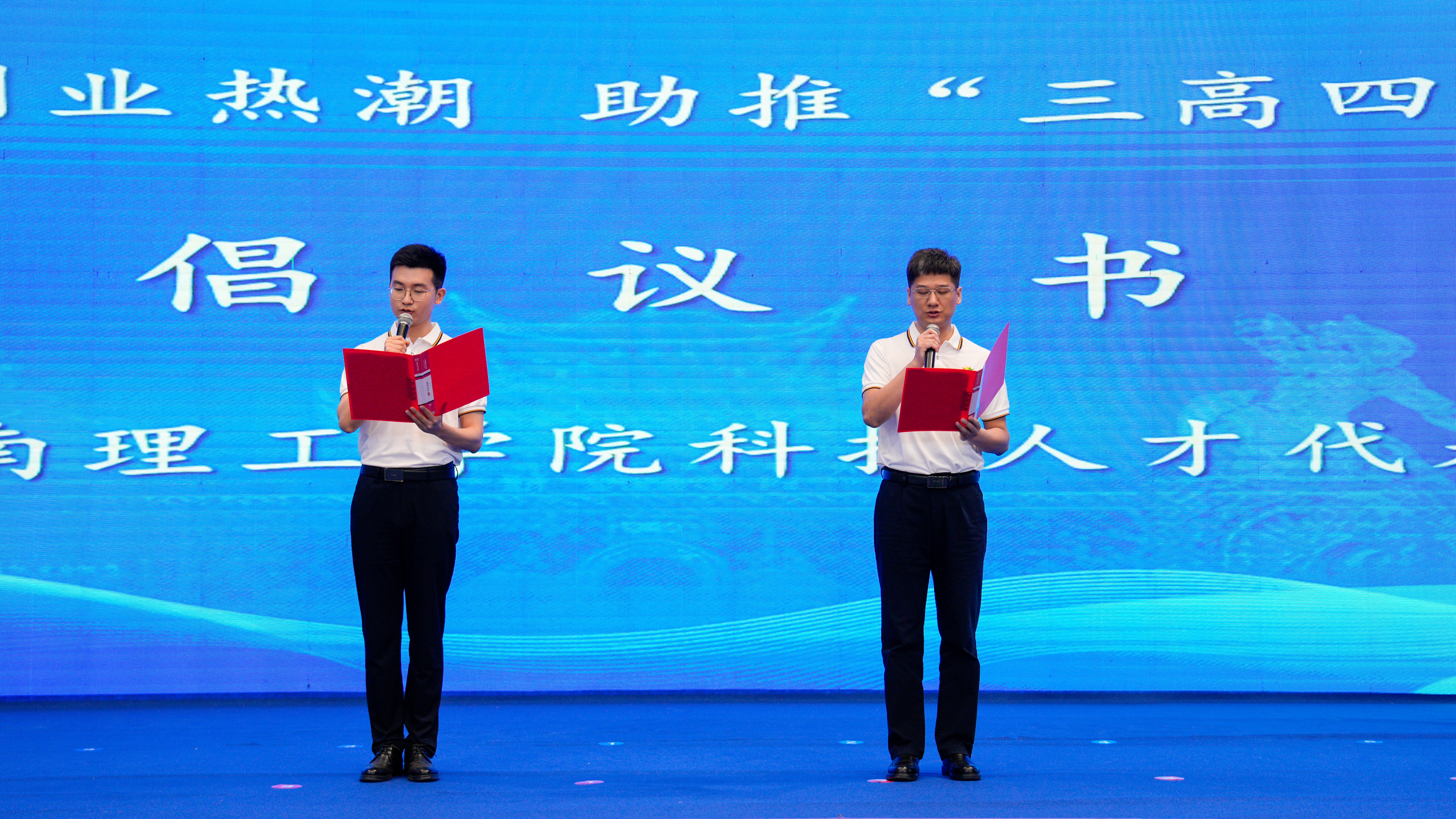 太阳成集团tyc教师代表宣读“投身创新创业热潮 助推‘三高四新’发展”倡议书